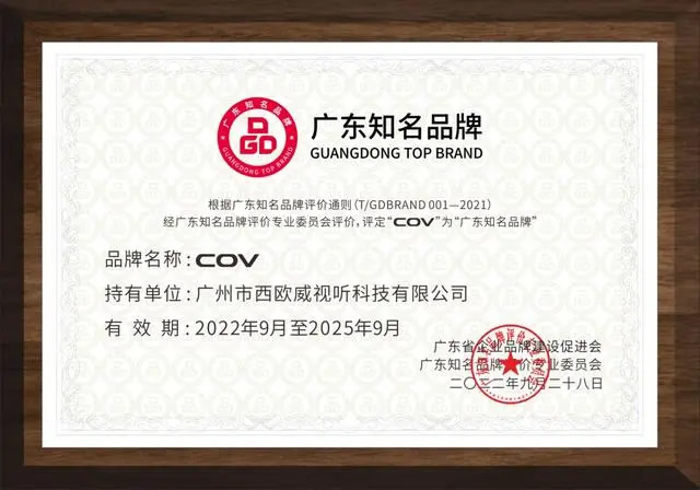 9月28日下午,2022广东品牌全球竞争力峰会,在广东广播电视台南星演播厅举行。峰会举行第三批“广东知名品牌”颁牌仪式,广州市西欧威视听科技有限公司旗下品牌COV音响成功入评,西欧威视听科技董事长彭纯锋先生出席峰会并接受了主办方颁发的证书。